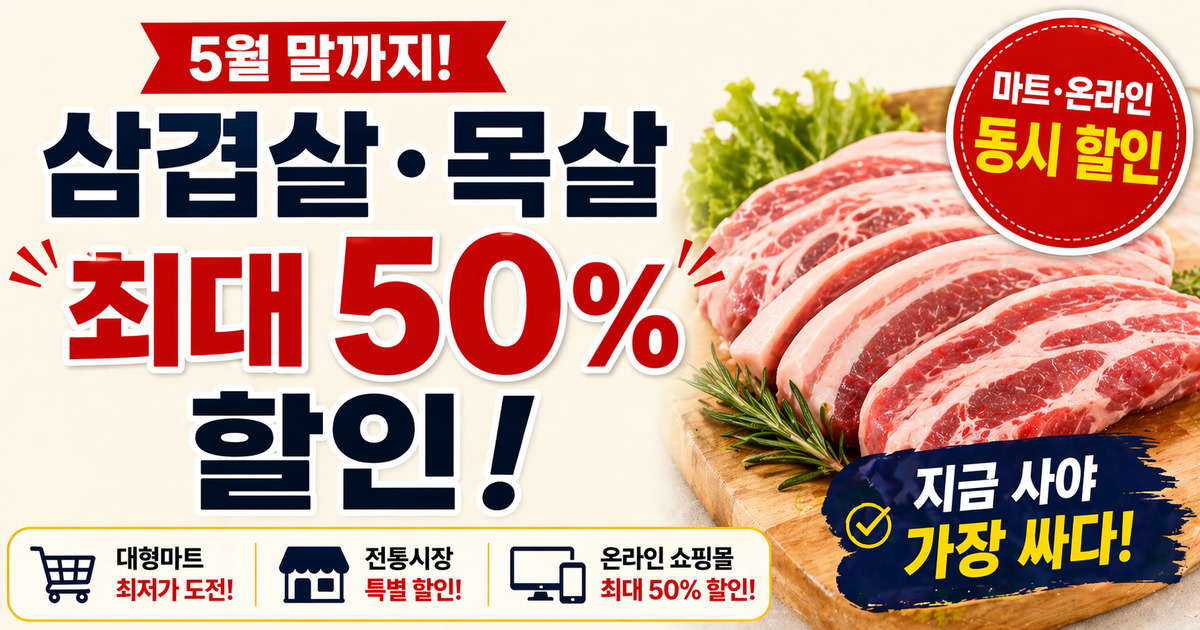 요즘 장을 보러 갈 때마다 느끼는 것이 있습니다. 예전보다 장바구니에 담기는 양은 줄었는데, 계산대 앞에서는 오히려 금액이 더 높게 찍히는 현실입니다. 특히 삼겹살이나 목살처럼 자주 먹는 고기류는 가격 부담이 크게 느껴질 수밖에 없습니다. 그런데 최근 반가운 소식이 하나 들려왔습니다. 바로 5월 말까지 삼겹살과 목살을 최대 50%까지 할인하는 행사가 진행된다는 내용입니다. 단순한 할인 이벤트가 아니라 물가 부담을 낮추기 위한 정책 성격까지 담겨 있어 더욱 주목할 필요가 있습니다.