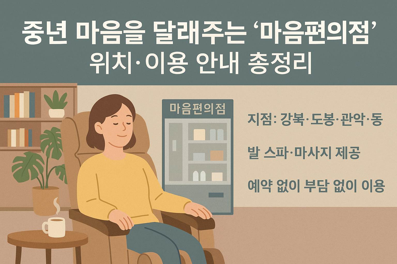 서울시가 운영하는 ‘마음편의점(Mind Convenience Store)’은 누구나 부담 없이 찾아와 잠시 쉬어갈 수 있는 심리·정서 지원 공간입니다. 특히 중년층 1인 가구나 바쁜 일상 속에서 잠깐의 쉼이 필요한 시민들에게 좋은 반응을 얻고 있습니다. 이곳에서는 발 스파, 마사지 체어, 차와 간식, 심리 상담 등 다양한 무료 서비스를 제공합니다.